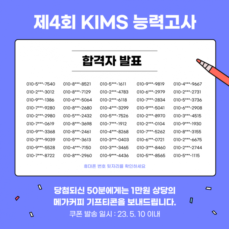 과학문화 <제4회 KIMS 능력고사> 당첨자 발표! 페이지 정보 작성자 운영자 댓글 0건 조회 983회 작성일 23-05-04 09:36 목록 본문 <제4회 KIMS 능력고사> 당첨자 발표! 이전글2023년도 여름방학 <배달해 과학> 신청 안내 23.08.08 다음글<제4회 KIMS 능력고사> 안내 23.04.17